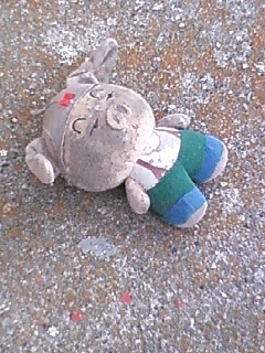 この写真は一年位前台風の翌日(ただの雨だったかもしれません…いつだったかな)に道で見かけた可哀相なヌイグルミです。最初裏向いてて、よもやと思って傘でつついてひっくり返したら案の定ギャルのパンティをかぶった彼でした。通勤路に5日くらい転がってたんですが、ある日消えていました。誰かが拾ったのか、はたまた捨てたのかは不明です。なんにせよコレを角度を変え、何度も撮りなおしていた私は軽く不審だったかと思います。なかなか上手く撮れなくて、これがベストショットでした。いらんベストショットです。
